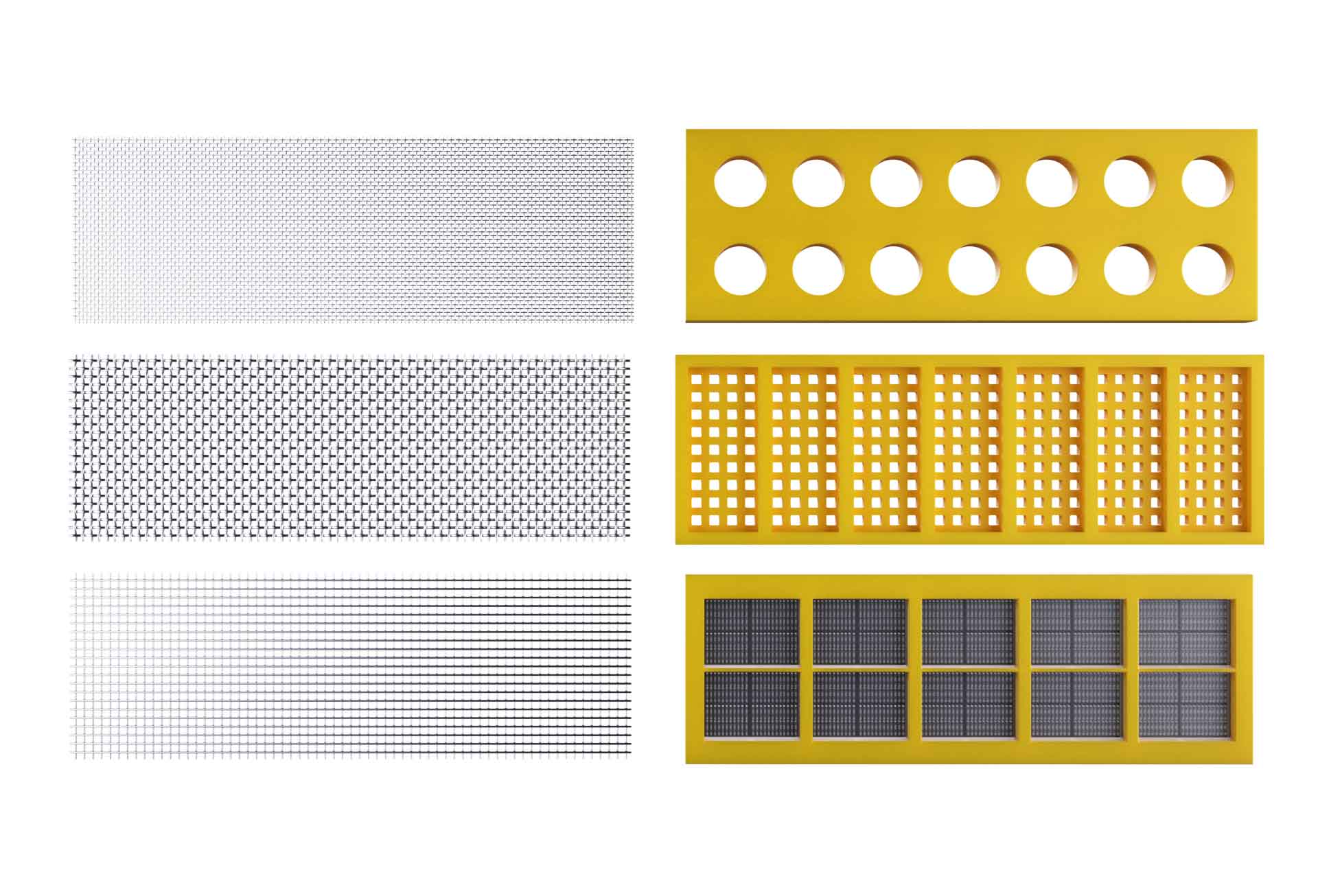 Bei uns bekommen Sie das klassische Grundstoffsieb (z. B. Drahtgewebe, Harfensiebe), Siebböden und Siebmatten aus PUR (Polyurethan) und Gummi.